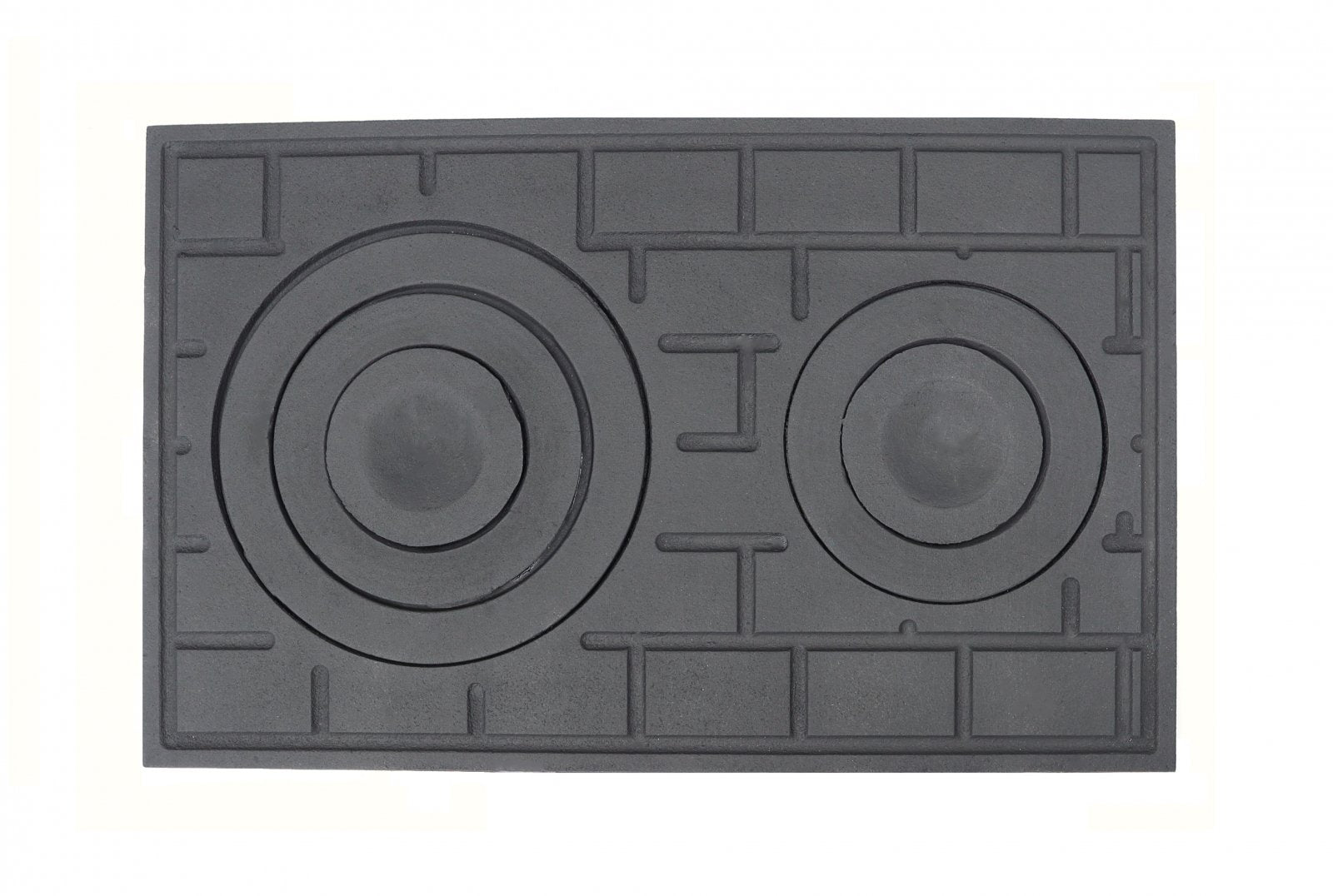 Plita de fonta cu doua ochiuri cu diametre diferite, ce poate fi folosita la constructia de sobe noi, dar si la sisteme barbeque.