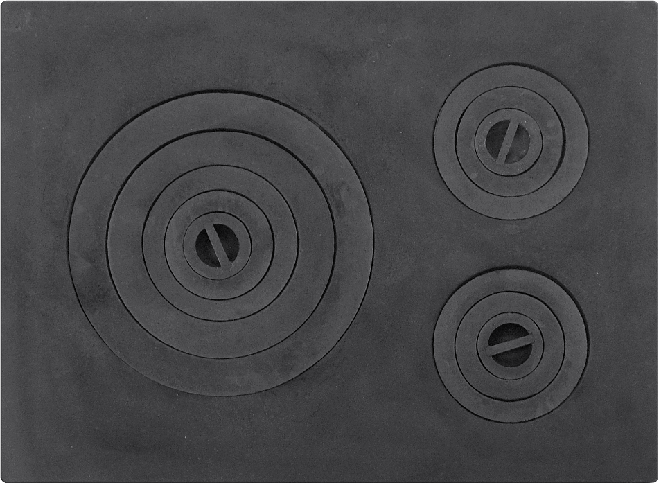 Plita din fonta cu trei ochiuri, pentru sobe traditionale. Design rotunjit la muchii cu trei ochiuri cu diametrul maxim de 240 mm. Durabilitate ridicata.