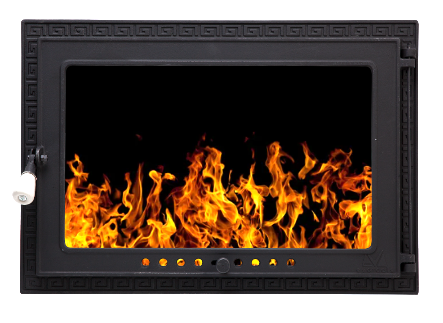 Ușă șemineu, confecționată din fontă cenușie turnată cu model reliefat, acoperită pentru rezistență la coroziune, cu vopsea neagră mată.