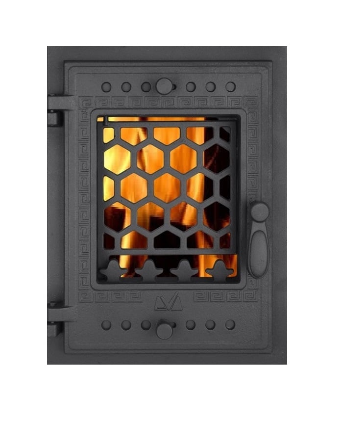Usa semineu cu geam, model cu fagure, la care este adaugat geamul termorezistent. Rezistenta termica a geamului este de pana la 700 grade Celsius. Materialul din care este produsa usa este din fonta, ceea ce-i confera o rezistenta mult mai mare in exploatare.