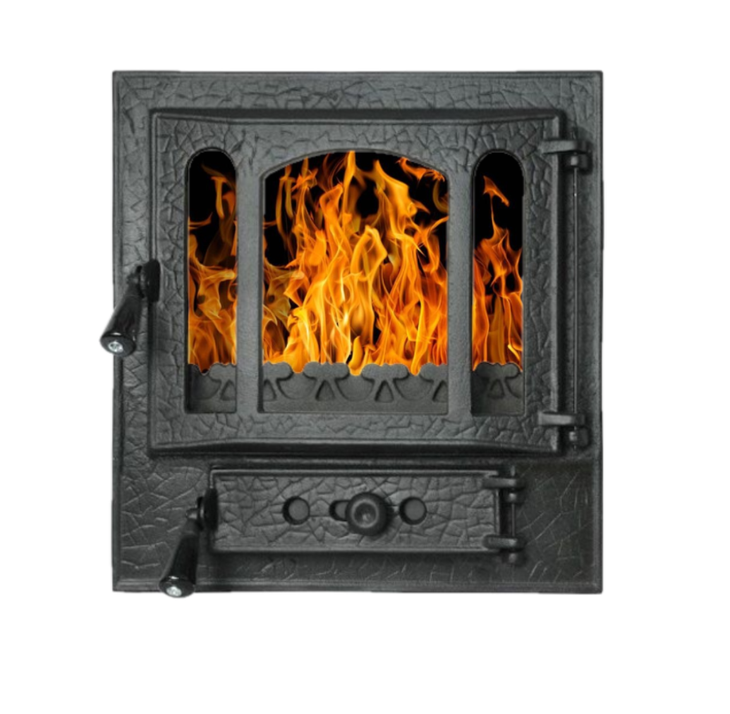 Usa de semineu din fonta cu trei sticle, model Panoramic mediu, ce poate fi folosita atat pentru constructia semineelor noi, cat si pentru reconditionarea celor vechi.