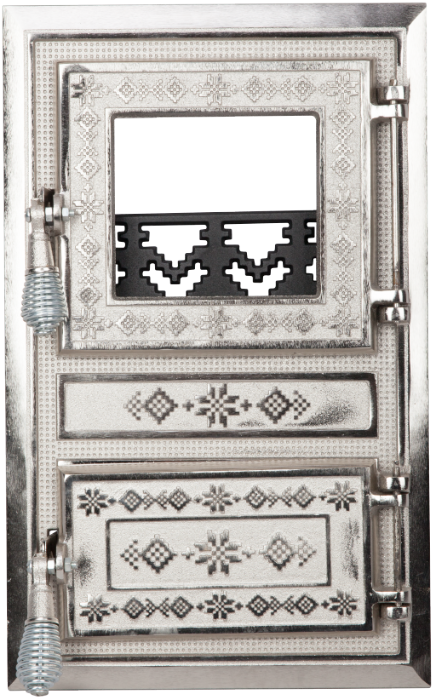 Usa monobloc pentru soba cu geam, model cu motive romanesti nichelata. Sticla are grosimea de 4 mm si...