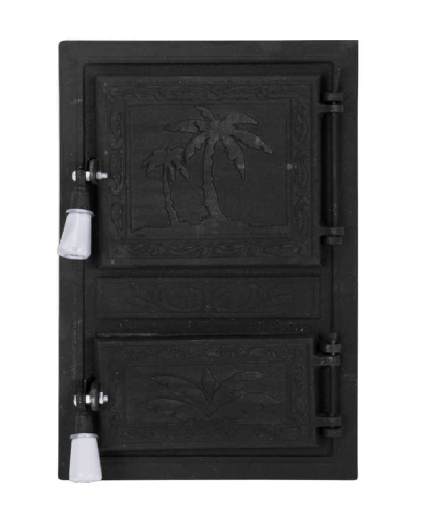 Usa pentru soba cu cenusar, tip monobloc, confectionata din fonta cenusie turnata cu model reliefat, acoperita pentru rezistenta la coroziune cu vopsea neagra mata.
